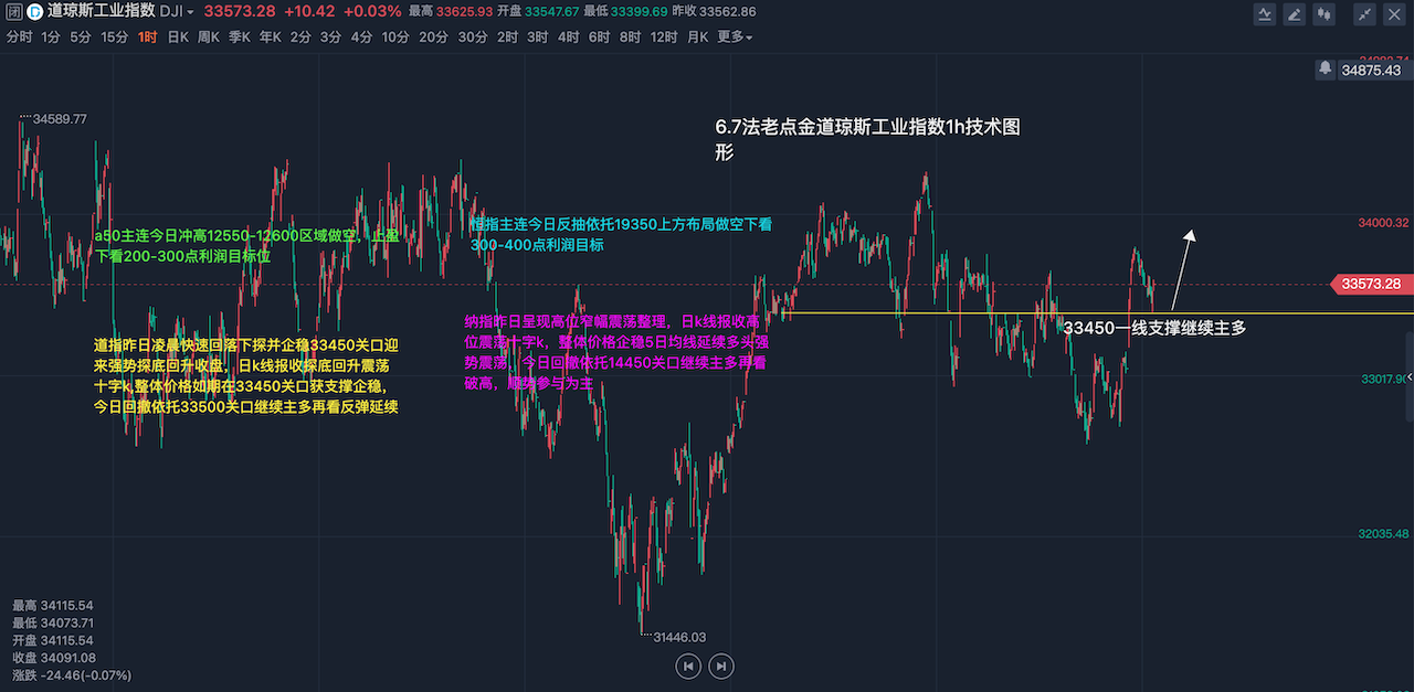 道指昨日凌晨快速回落下探并企稳33450关口迎来强势探底回升收盘,日k线报收探底回升震荡十字k,整体价格如期在33450关口获支撑企稳,昨日美盘33450一线布局多单最终完美到达33640上方止盈利润,昨日日线级别报收探底回升震荡十字k,今日依托昨日低点继续主多再看震荡回升延续,下方支撑关注33500关口继续主多,近期多空强弱分水岭33300关口,日线级别企稳此位置上方继续保持强势多头上行节奏不变,目前技术面已重回多头反弹上行通道中,只要回撤就是进场做多机会,纳指昨日呈现高位窄幅震荡整理,日k线报收高位震荡十字k,整体价格企稳5日均线延续多头强势震荡,今日回撤依托14450关口继续主多再看破高,顺势参与为主,日线级别依托5日均线依旧保持震荡上行节奏不变,高位强势横盘不是顶,多头加速随时会出现,今日下方支撑关注14450-14500区域,只要给到回撤就是进场做多机会,上方目标位继续看破高,顺势参与为主,具体操作策略我会在盘中提示,及时关注。