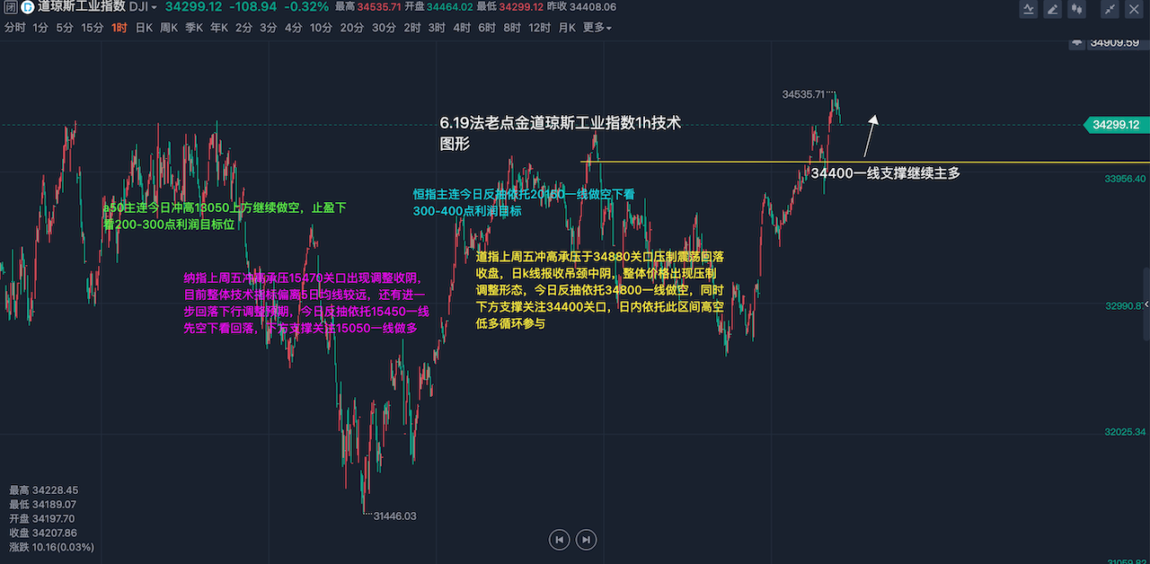 道指上周五冲高承压于34880关口压制震荡回落收盘,日k线报收吊颈中阴,整体价格承压34900关口出现压制调整形态,今日短线反抽依托34800一线先空下看延续回落,同时下方支撑关注34400关口,日内依托此区间高空低多循环参与继续看震荡运行,整体形态上依旧保持多头强势震荡上行节奏,日线级别高位背离调整不改变中期上涨形态,日内回踩企稳34400关口可继续做多,纳指上周五冲高承压15470关口出现调整收阴,目前日线级别整体技术指标偏离5日均线较远,短线来看还有进一步回落下行调整预期,今日反抽依托15450一线先空下看回落,下方支撑关注15050一线做多,日内依托15450-15050区间先行看多空震荡运行,中间位置一律多看少动谨慎追单,耐心等待关键点位进场,具体操作策略我会在盘中提示,及时关注。