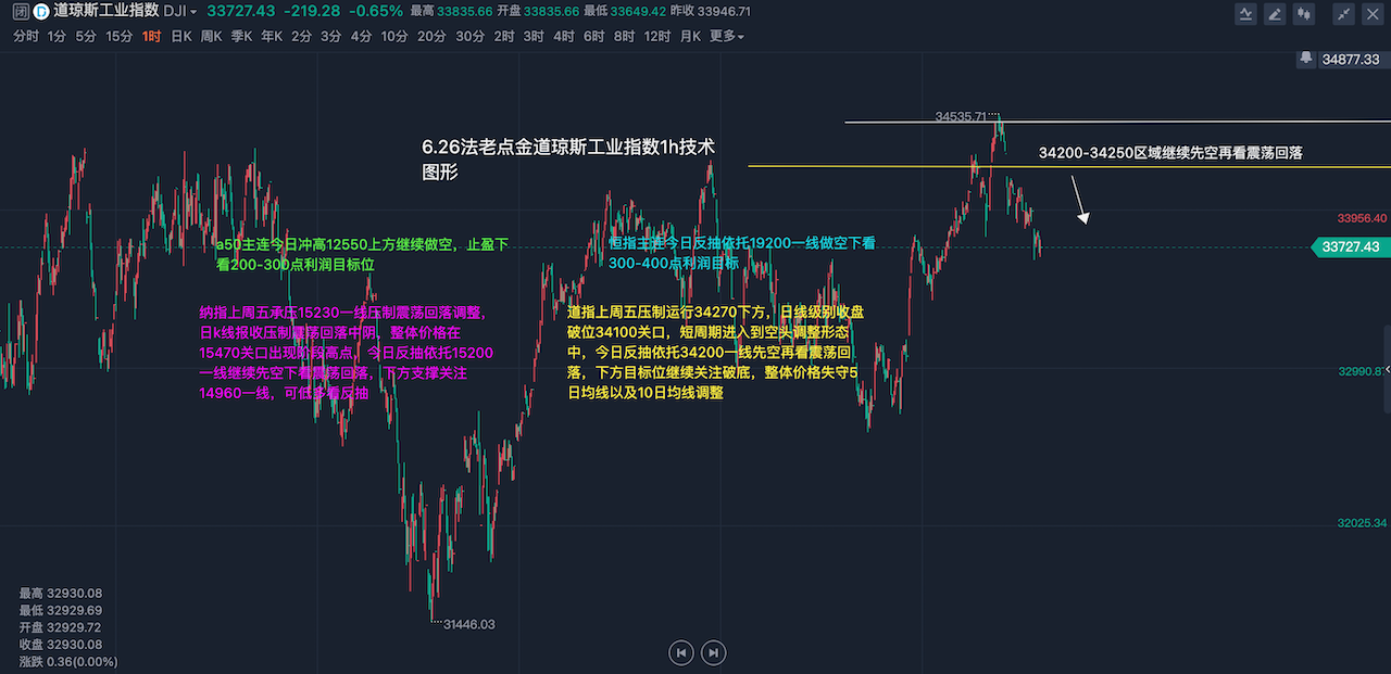 道指上周五压制运行34270下方,日线级别收盘破位34100关口,上周明确提到34100关口是近期多空强弱分水岭,一单跌破此位置短周期将进入到空头调整形态中,今日反抽依托34200一线继续先空再看震荡回落,下方目标位依旧关注破底,整体价格失守5日均线以及10日均线进入到调整形态,今日反抽先空下看震荡回落,纳指上周五承压15230一线压制震荡回落调整,日k线报收压制震荡回落中阴,整体价格在15470关口出现阶段高点,短线同样进入到调整形态中,今日反抽依托15200一线继续先空下看震荡回落,下方支撑关注14960一线,美盘企稳此位置可低多看反抽,纳指短期技术指标出现高位背离形态,今日反抽依托15200一线先空下看震荡回落,等待调整充分后再介入多单,而道指目前彻底进入到空头压制调整形态中,任何反抽均是进场做空机会,日线级别多空强弱分水岭34400关口,中间位置一律多看少动谨慎追单,耐心等待关键点位进场,具体操作策略盘中实时提示,及时关注。