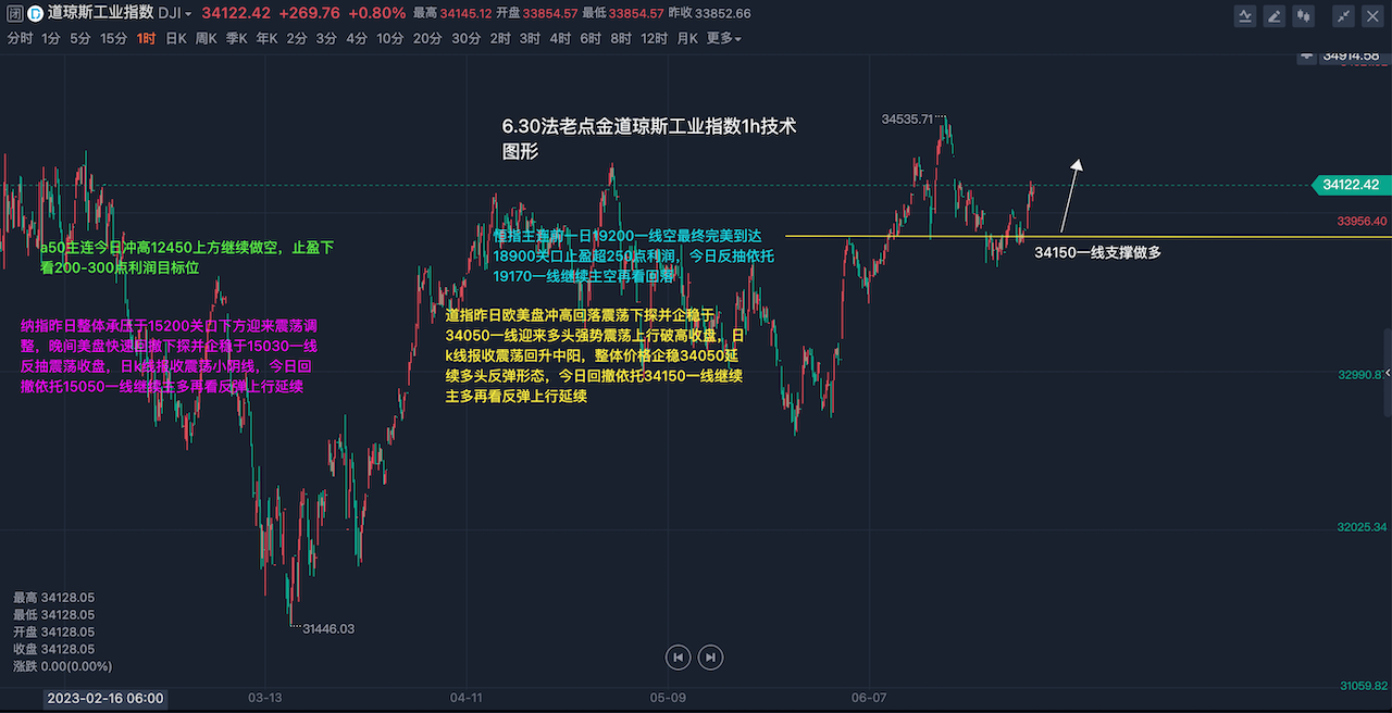 道指昨日欧盘压制回落震荡下探并企稳于34050一线迎来多头强势震荡上行破高收盘,日k线报收震荡回升中阳,整体价格企稳34050延续多头反弹形态,和我们昨日盘中预期一致,并且昨日研报34050支撑做多也是完美验证,日k线继续保持强势反弹连阳形态,短中期均线多头排列向上发散,多头上行趋势明显,今日下方支撑继续关注昨日小时线颈线位34150关口,日内回撤依托此位置继续主多再看反弹延续。保持顺势参与节奏不变,纳指昨日整体承压于15200关口下方迎来小幅震荡调整,晚间美盘快速回撤下探并企稳于15030一线反抽震荡收盘,日k线报收震荡小阴线,整体形态依旧保持多头上行节奏中,今日回撤依托15050一线继续主多再看反弹上行延续,道指纳指短周期重回多头强势反弹形态中,今日收周线叠加月线,操作上继续保持顺势低多参与节奏不变,只要回踩就是进场做多机会,顺势参与为主,具体操作策略盘中实时提示,及时关注。