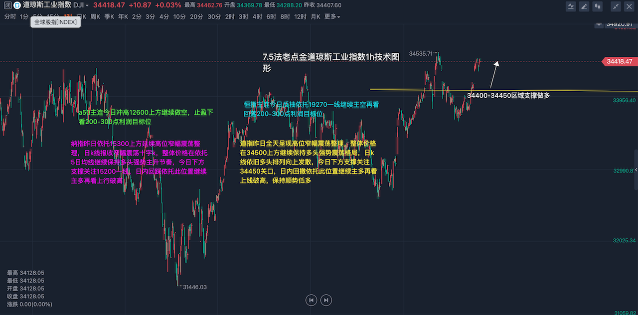 道指昨日全天呈现高位窄幅震荡整理,整体价格在34500上方继续保持多头强势震荡格局,日k线依旧多头排列向上发散,短线依旧延续多头震荡上行破高节奏,今日下方支撑关注34450关口,日内回撤依托此位置继续主多再看上线破高,保持顺势低多保持顺势参与节奏不变,纳指昨日依托15300上方延续高位窄幅震荡整理,日k线报收窄幅震荡十字k,整体价格在依托5日均线继续保持多头强势主升节奏,今日下方支撑关注15200一线,日内回踩依托此位置继续主多再看上行破高,道指纳指目前均保持多头强势主升形态,操作上继续保持顺势低多参与节奏不变,只要回踩就是进场做多机会,顺势参与为主,具体操作策略盘中实时提示,及时关注。