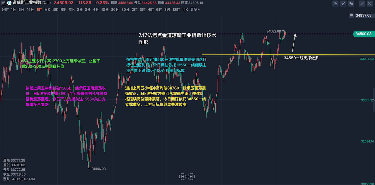 道指上周五小幅冲高刺破34780一线承压回落震荡收盘,日k线报收冲高回落震荡中阳,整体价格延续高位强势震荡,目前短中期均线多头排列继续向上发散,依旧延续多头强势形态中,今日下方支撑关注34550-34500区域,日内回踩依托此区域支撑继续做多,上方目标位继续关注破高,整体价格企稳5日均线上方延续多头强势形态,今日回踩5日均线依托34500一线继续主多再看上行破高,保持顺势低多保参与节奏不变,近期道指多空强弱分水岭34200关口,日线级别企稳此位置上方保持顺势参与主基调,任何回踩均是做多机会,纳指上周五冲高刺破15850一线承压回落震荡收盘,日k线报收冲高回落十字k,整体价格延续高位强势震荡整理,今日下方支撑关注15550关口,日内回踩企稳此位置继续做多再看涨,保持顺势参与主基调,逆势空单一律不参与,回踩就是做多机会,道指纳指目前均保持多头强势主升形态,操作上继续保持顺势低多参与节奏不变,顺势参与为主,具体操作策略盘中实时提示,及时关注。