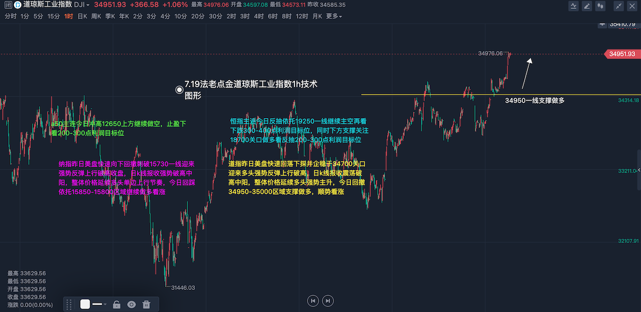 道指昨日美盘快速回落下探并企稳于34700关口迎来多头强势反弹上行破高,日k线报收震荡破高中阳,整体价格延续多头强势主升节奏,今日回撤34950-35000区域支撑做多,继续顺势看涨,上方目标位继续关注破高,道指整体价格企稳5日均线上方延续多头强势形态,保持顺势低多保参与节奏不变,近期多空强弱分水岭34300关口,日线级别企稳此位置上方保持极强多头形态不变,顺势低多依旧是主基调,任何回踩均是做多机会,纳指昨日美盘快速向下回撤刺破15730一线迎来强势反弹上行破高收盘,日k线报收强势破高中阳,整体价格延续多头单边上行节奏,今日回踩依托15850-15800区域继续做多看涨,保持顺势参与主基调,逆势空单一律不参与,回踩就是做多机会,道指纳指目前均保持多头强势主升形态,操作上继续保持顺势低多参与节奏不变,顺势参与为主,具体操作策略盘中实时提示,及时关注。