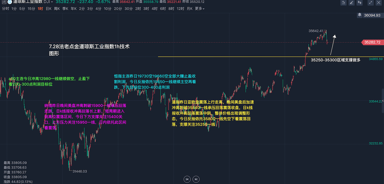 道指昨日亚欧盘震荡上行走高,晚间美盘后加速冲高刺破35840一线承压回落震荡收盘,日k线报收冲高回落震荡中阴,整体价格高位出现强势调整,不过日线级别依旧企稳10日均线上方延续多头强势主升形态,整体趋势以及节奏上面依旧保持多头强势多头格局,今日下方支撑关注35400一线,日内回踩依托此位置支撑继续看涨,上方短线压力关注35750-35800附近,美盘冲高承压此位置可短空一次再看震荡回落,近期多头强势分界线上移至35300关口,日线级别企稳此位置上方继续保持强势主升形态不变,顺势低多依旧是主基调,纳指昨日晚间美盘冲高刺破15900一线承压回落走跌,日k线报收冲高回落长上影,纳指短周期进入到高位宽幅震荡区间,今日下方支撑关注15450-15400区域,上方短线压力关注15850-15900区域,美盘冲高承压此位置可短空一次再看震荡回落,纳指整体价格依旧企稳于20日均线上方保持强势震荡形态,日线级别调整单阴不改整体多头主升趋势,今日回撤依托15500一线先行主多再看反弹回升,短期纳指多头强势分界线15500关口,日线级别企稳此位置上方继续保持强势震荡节奏,做空需要关键点位进场,且快进快出,不恋战,具体操作策略盘中实时提示,及时关注。