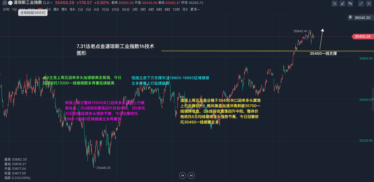 道指上周五亚盘企稳于35400关口延续多头震荡上行反弹回升,晚间美盘加速冲高刺破35700一线强势收盘,日k线报收强势震荡中阳,整体价格依托5日均线继续多头强势节奏,非常明确的多头主升形态,今日下方支撑关注35400-35450区域,日内回撤依托此位置支撑继续看涨不变,上方目标位继续关注破高,近期多头强势分界线上移至35300关口,日线级别企稳此位置上方继续保持强势主升形态不变,顺势低多依旧是主基调,纳指上周五整体依托15500关口迎来多头强势上行破高收盘,日k线报收强势回升反包中阳,日k依托20日均线延续多头强势主升节奏,今日下方支撑关注15600-15650区域,日内回撤依托此位置继续主多再看涨,纳指整体价格依旧企稳于20日均线上方保持强势主升形态,日线级别高位震荡不改整体多头主升趋势,短期纳指多头强势分界线15500关口,日线级别企稳此位置上方继续看涨不变,逆势空单一律不参与,具体操作策略盘中实时提示,及时关注。