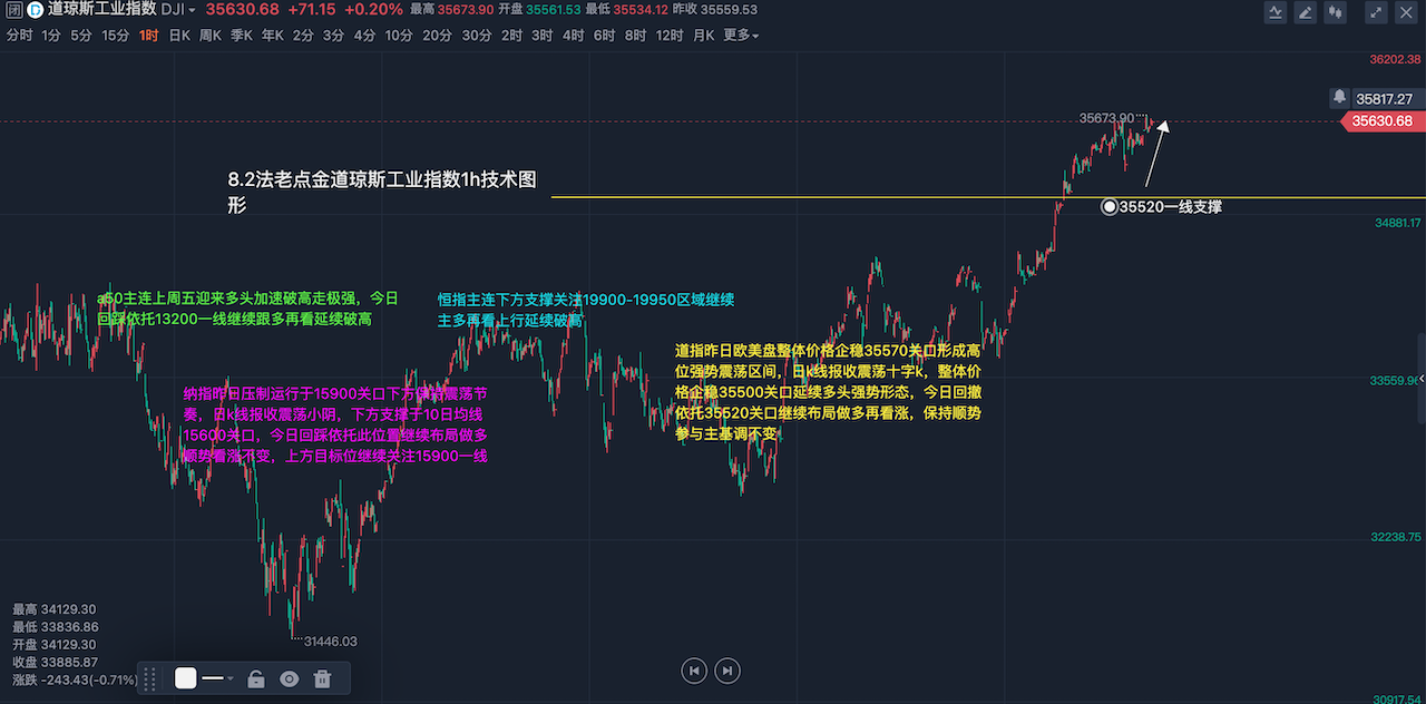 道指昨日围绕35570-35800区间窄幅震荡整理,日k线报收震荡十字k,整体价格延续高位强势震荡,短线依托10日均线保持多头强势形态,今日下方支撑关注35450一线,日内回撤依托此位置继续主多再看涨,上方短线压力35800关口,美盘冲高承压此位置可短空一次再看震荡回落,整体依托此区间高空低多循环参与看多空震荡区间,短线价格失守5日均线进入到多空宽幅震荡区间,高空低多循环参与看多空震荡运行节奏,日线级别企稳10日均线上方依旧保持多头强势形态,做空只能快进快出,不恋战,纳指昨日压制于15900下方高位震荡回落走调整,短线失守5日均线进入到调整形态中,今日下方将继续考验20日均线15600关口支撑力度,日内欧盘回撤企稳此位置可短多一次再看涨,上方短线压力关注15850一线,美盘冲高承压此位置可短空一次再看震荡回落,日内依托15600-15850区域看震荡,具体操作策略盘中实时提示,及时关注。