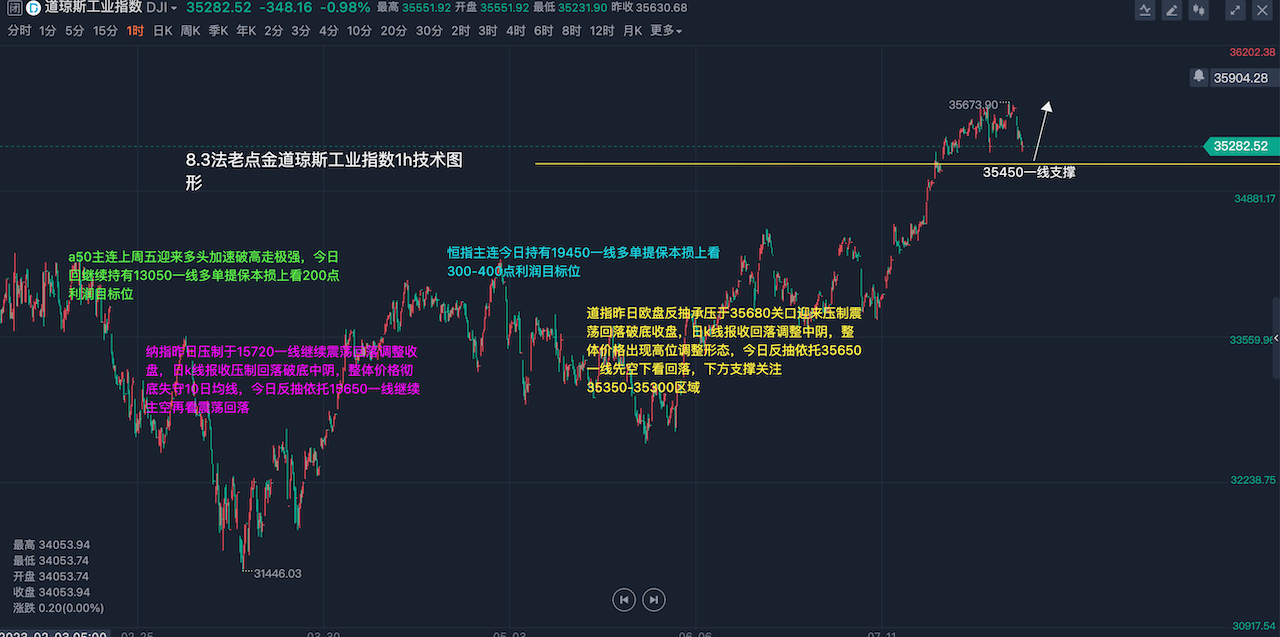 道指昨日欧盘反抽承压于35680关口迎来压制震荡回落破底收盘,日k线报收回落调整中阴,整体价格出现高位调整形态,今日反抽依托35500-35550区域先空下看回落,下方支撑关注35000整数关口,下破此位置将彻底进入到空头单边下行通道,日内反抽依托35500关口先空一次再看延续回落,短线失守10日均线支撑整体将迎来空头调整形态中,下方将考验20日均线支撑企稳力度,日内反抽依托35500-35550附近先空一次看震荡回落,等待出现明确企稳信号后再介入多单,纳指昨日压制于15720一线继续震荡回落调整收盘,日k线报收压制回落破底中阴,整体价格彻底失守10日均线,短期彻底进入到空头调整形态中,今日反抽依托15600一线继续主空再看震荡回落,目前位置多单暂时不参与,近期纳指多空强弱分水岭15800关口,日线级别未突破并站稳此位置之前,继续看压制回落调整,具体操作策略盘中实时提示,及时关注。