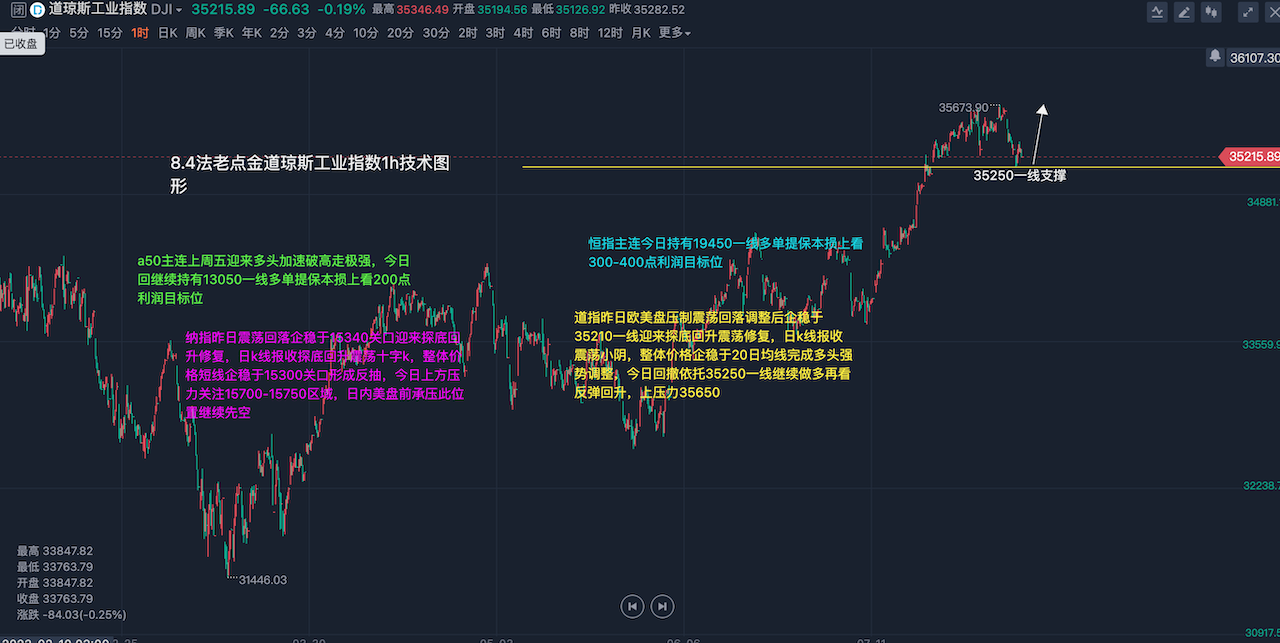 道指昨日欧美盘压制震荡回落调整后企稳于35210一线迎来探底回升震荡修复,日k线报收震荡小阴,整体价格企稳于20日均线上方完成多头强势调整,短期均线粘合,今日若企稳35200关口有望进一步反弹回升站上5日均线上方运行,短期多头形态依旧存在,今日回撤依托35250一线继续做多再看反弹回升,上压力35650关口,美盘冲高承压此位置可短空一次看震荡回落,整体节奏上保持高位震荡区间,多空强弱分水岭关注35000整数关口,日线级别企稳此位置上方继续保持多头震荡上行节奏不变,做空只能等待关键点位进场且快进快出不恋战,纳指昨日震荡回落企稳于15340关口迎来探底回升修复,日k线报收探底回升震荡十字k,整体价格短线企稳于15330关口形成反抽,今日上方压力关注前期日线级别开跌口15700-15750区域,日内美盘前承压此位置先空一次看震荡回落,下方支撑继续关注昨日低点15350附近,美盘回踩企稳此位置可短多一次再看反弹回升,近期纳指多空强弱分水岭15800关口,日线级别承压此位置下方依旧看高位震荡区间,保持高空低多节奏不变,具体操作策略盘中实时提示,及时关注。