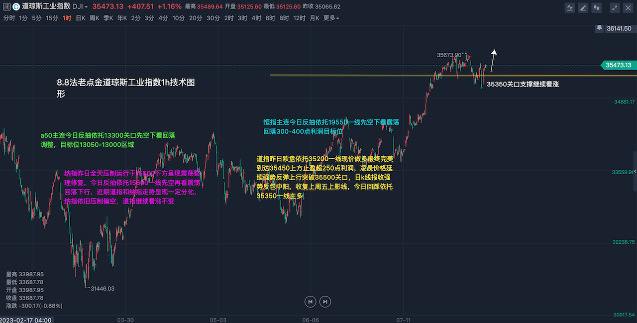 道指昨日欧盘依托35200一线现价做多最终完美到达35450上方止盈超250点利润,凌晨价格延续强势反弹上行突破35500关口,日k线报收强势反包中阳,收复上周五上影线,整体价格延续多头强势反弹节奏,今日下方支撑继续关注小时线颈线位35350-35400附近,日内回踩依托此位置继续主多再看涨,道指近期多空强弱分水岭关注35000整数关口,日线级别企稳此位置上方继续保持多头强势震荡节奏,纳指近期走势和道指出现一定程度分化,纳指昨日全天压制运行于15500下方呈现震荡整理修复,日线级别跌破5日均线以及10日均线支撑出现死叉向下,短线还有进一步下行回落预期,今日反抽依托15600一线继续先空再看震荡回落下行,近期纳指多空强弱分水岭15800关口,日线级别承压此位置下方依旧看震荡回落调整,保持压制偏空对待,具体操作策略盘中实时提示,及时关注。