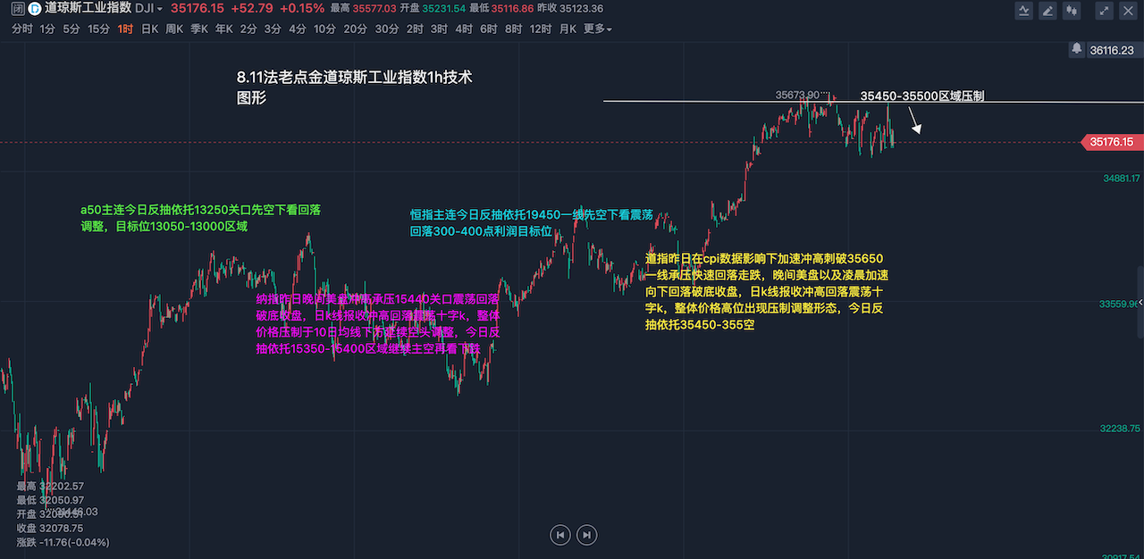 道指昨日在cpi数据影响下加速冲高刺破35650一线承压快速回落走跌,晚间美盘以及凌晨加速向下回落破底收盘,日k线报收冲高回落震荡十字k,承压5日均线以及10日均线出现压制调整形态,今日反抽依托35450-35500继续主空再看延续回落,下方短线支撑继续关注35100关口附近,日内先行依托此区间高空低多循环参与看多空震荡运行,今日35500下方继续压制偏空对待,日线级别企稳此位置上方继续保持多头强势震荡节奏,纳指昨日晚间美盘冲高承压15440关口震荡回落破底收盘,日k线报收冲高回落震荡十字k,整体价格压制于10日均线下方延续空头调整,今日反抽依托15350-15400区域继续主空再看下跌,整体形态依旧呈现空头向下,下方目标位继续看回落下行破底,纳指日线级别跌破10日均线以及20日均线支撑出现死叉向下,短线还有进一步下行回落预期,近期纳指多空强弱分水岭15500关口,日线级别承压此位置下方依旧看压制震荡回落调整,保持反抽主空节奏不变,今日周五道指纳指继续以反抽空顺势参与为主,具体操作策略盘中实时提示,及时关注。