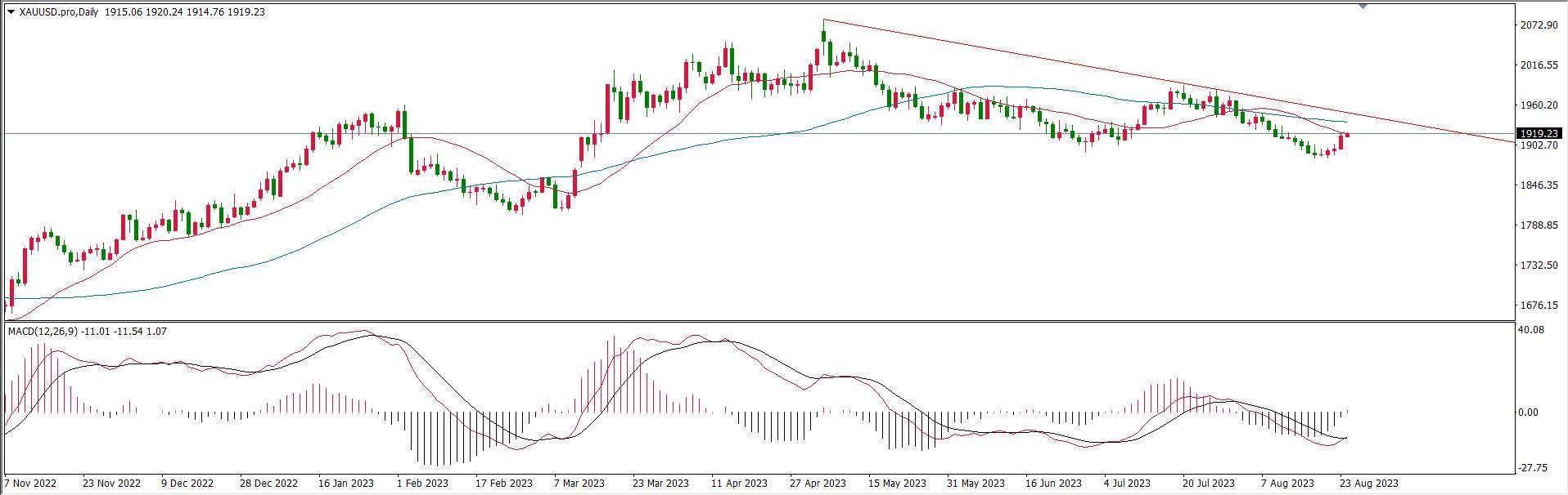 昨天受到PMI数据利多影响,黄金再次上涨触及1920价格。从图中我们可以观察到,目前黄金到达20日均线位置,同时MACD即将金叉,但是处于0周下方,说明现在就判断行情反转还为时尚早,除非突破上方大级别空头通道上轨才能够成立,回调总是会有,现在就是在4浪回调当中。今天的交易思路:激进者1920附近尝试做空,稳健者1925附近做空,目标1900.