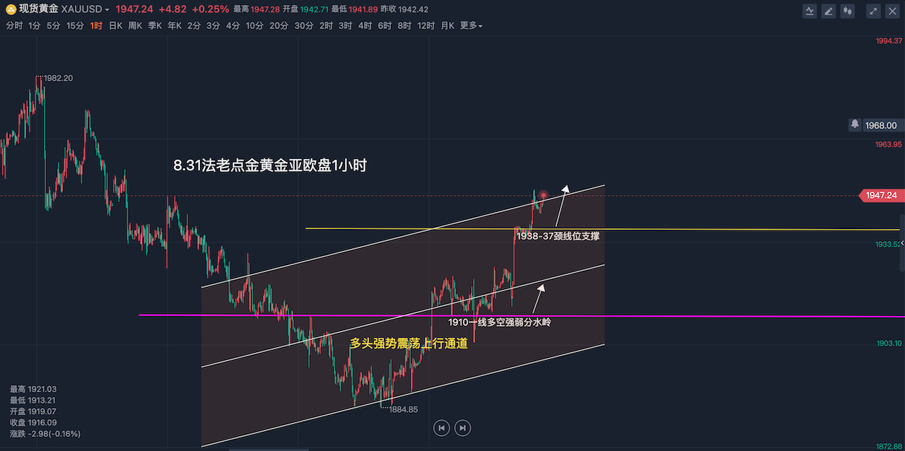 08/31 09 : 358月31日【黄金原油】亚欧盘:黄金昨日1947-48空小赚止盈,多头强者恒强延续单边上涨,今日回撤依托1938一线继续主多再看涨,原油昨日82一线空精准狙击完美止盈,今日围绕80.8-82.3高空低多循环参与看震荡