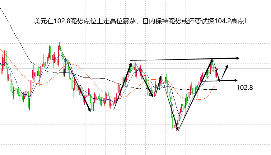 周四的双重数据影响不尽人意,美元在周三触及102.8支撑不破后形成反弹,周四延续反弹,持续走高,目前高点在103.6附近,完全符合前期预测的美元只要保持在102.8之上则看强势震荡慢涨,因此,美元暂时还是要保持多头趋势看涨。至于今天非农数据影响,山海看好大概率还是要冲高一波,继续看104.2高点的得失,通过周三ADP数据,周四失业金数据来看,9月非农不看好有太大的影响,预计在104.2/102.8区间内走来回震荡。