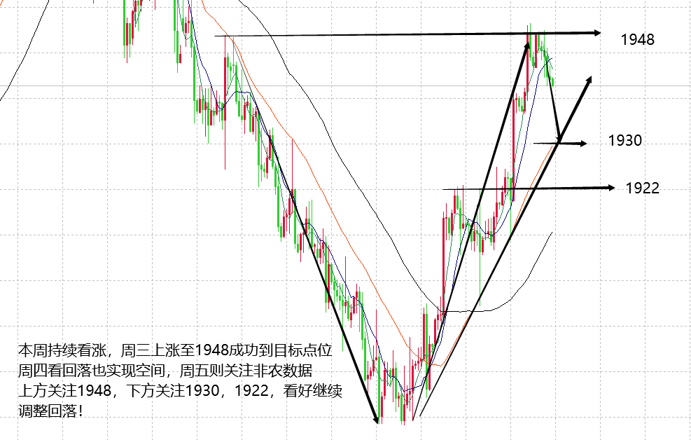 今天周五,本周黄金从周一开始看涨,周二,周三继续看涨,最高到了山海预测的高点1948,周四山海提示过,在数据影响下,大概率是冲高回落,不要再过分看高,因此,周四山海在美盘给出1946的空单,在午夜慢跌,最低至1938,也有部分空间,三天做多,一天做空,连续获利。这个行情走到现在,就要看周五的变化。虽然周四黄金走出调整,有回落空间,但值得注意的是,目前黄金还没有见顶,暂时依旧是多头趋势,而且今天又要迎接重要数据,9月非农。通过周四黄金的回落,我们可以看到,黄金上涨至1948/1950中期高点,多头趋势虽然没有变,但多头暂时有无力的表现,这里技术面有周线布林中轨,日线布林上轨的压制,特别是日线布林暂时收口,周四日线收一个墓碑线,很有可能市场借助9月非农数据影响,打击一下市场多头过热的表现,因此,只要黄金保持在1948之下,日线布林没有开口的情况下,黄金就不要过分看涨,谨防下跌扫盘。再者,日线下方的单边均线支撑在1936,1922,跌破1936后,可以确定黄金会走高位震荡,跌破1922后,这波黄金多空趋势就有所改变,后市将二次去1880低点。所以,这个周期虽然看涨黄金,但注意可能在9月初走出多空转换。对于日内行情而言,今天的重点当然是要关注非农数据表现,前值是18.7w,市场预测值是17w,如果实际公布值接近或者小于前值,小幅利空美元,利多黄金,如果实际公布值大于前值,则是利多美元,利空黄金,根据市场预测来看,今天的非农数据不出意外,不会有很大影响,应该是走来会震荡。在盘中表现关注H4周期的上下区间,高点1955,低点则看1930,1922。综上所述,9月非农数据将是多空转换的契机,可能出现反转行情,交易方面不要在1948之下追多,在美盘关注1955,1948高点的试探,不破都可以尝试做空,有效下跌则可见1930,1922低点。