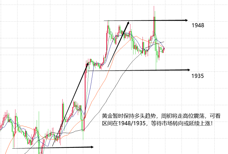 9月非农数据公布后对市场的影响,以及9月整体市场的看法在周评中给出了详细的分析,包括周初看震荡也给出了明确的依据,暂时黄金收盘在1940附近,文章开篇再次强调行情的走势基调,周初黄金看震荡。基本盘中,经过周五非农数据的影响,日线在周五收十字星,并且收线在布林上轨之下,很明显,暂时受技术面压制,黄金可能在当下形态中走出震荡下跌空间内,有效下跌力度可见日线布林下轨1890之下。但目前多头趋势未改,表现依旧强势,所以,暂时不能说在布局高位空单,坚决看跌。因此,本周大概率是走高位震荡,要么等待多头延续上涨,要么等待多空转向,走出下跌。本周黄金强弱的延续预计在本周三之后才能出现,大家耐心等待。对于周初的震荡,我们关注当日行情变化,目前小时线周期收口在1948/1935区间,这个震荡区间预计较难打开,只要不破此区间,就可以做有效的高空低多积累,周一纽交所休市,更加难有资本市场的大作为,所以,日内可大胆在此区间内做有效交易。
