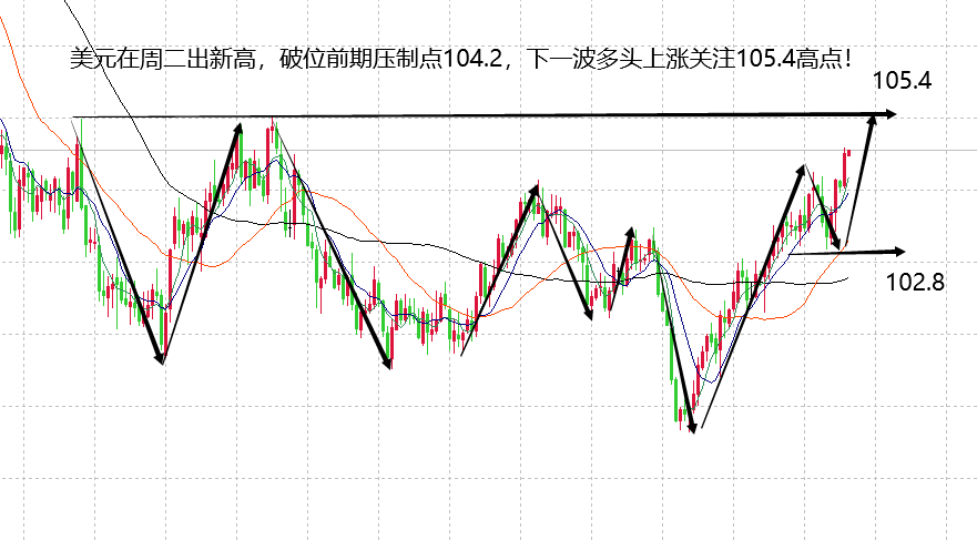 美元周一震荡,周二按照预期突破上涨,在欧盘就破位前期高点104.2,强势明显,一度上涨至104.8高点。今天的思路就非常简单,也非常明显,在突破高点后,延续上涨走势,下一波上涨空间可看至105.4前高,这也是山海自前期美元在99.3见底以来坚持看涨的周期性目标。所以,把这波美元的上涨空间看完,再看是否有调整空间。那么,在此环境下,美元一直是强势,黄金自然被打压走弱,所以,近期不要看现货黄金有较大的上涨或者反弹空间。