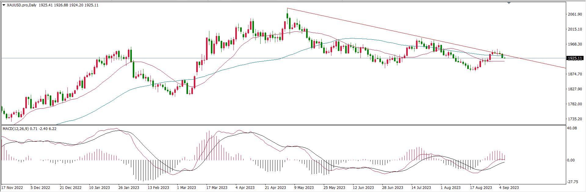 从图中我们可以很明确的看到,第一:昨天收出看空形态,第二:价格重新回到下降通道之内,之前的突破为假破,第三:MACD有死叉迹象,第四:价格又回到60日均线下方,支撑位置就在20日均线处,价格在1915附近。周线级别:20日均线压力有效,MACD依旧是死叉,说明之前的两周上涨位回调,空头仍在继续。4小时级别,昨天跌破1935关键支撑,同时也跌破小级别上升通道,所以今天的交易思路依旧重点做空,1930附近就可以考虑,目标1920.