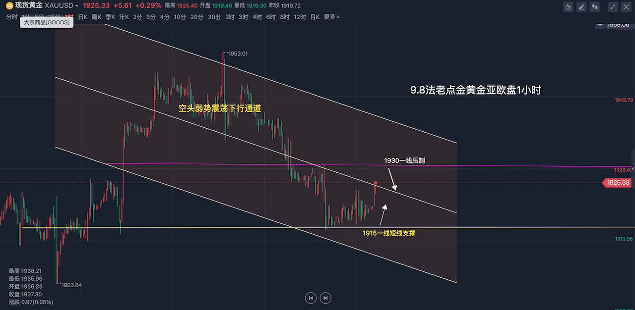 09/08 09 : 339月8日【黄金原油】亚欧盘:黄金昨日企稳1915震荡修复收阳,今日压制1930下方继续看跌不变,原油昨日86.8一线多87.6止盈,今日回踩依托85.5一线继续主多顺势看涨不变
