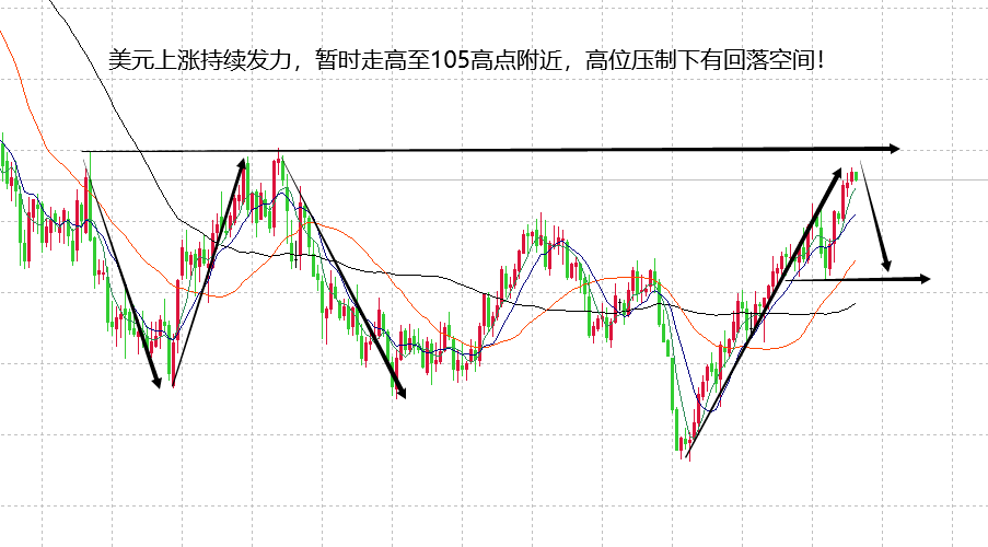 美元在周四继续慢涨,最高在105附近,几乎接近上方高位压制点,山海一直强调,本周期美元在99.4开始看涨,周期性大涨要看105.4高点,这波已经到了105高点,单看美元就不要过分看涨,特别是周五行情,很可能在高位压制点下走出调整回落空间。因此,即使暂时看强势,也要谨防美元随时回落带来助涨黄金的效果,所以,周五美盘反倒是要注意黄金在低位震荡中的反弹空间。