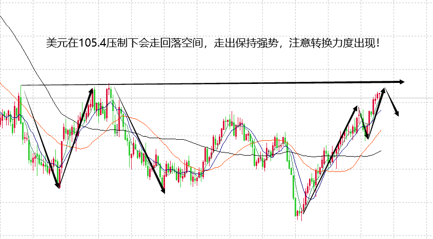 美元近期每一波涨跌节奏基本都预测成功,前期在99.2低位筑底,上涨至104.2后,看回落至102.8,这个周期又在102.8见底之后再次上涨,目前又冲高至105.1附近,几乎抓住了全部的涨跌,目前美元又到快到顶部,本周周期可能会出现转换,大家注意跟上节奏。暂时价位在104.8附近,周内会走出慢跌空间,下方关注两个支撑点104.2,102.8,其中,跌破104.2可确定走高位震荡,跌破102.8可确定趋势转变。所以,在美元此环境下,本周黄金还是一个上涨的基本环境。