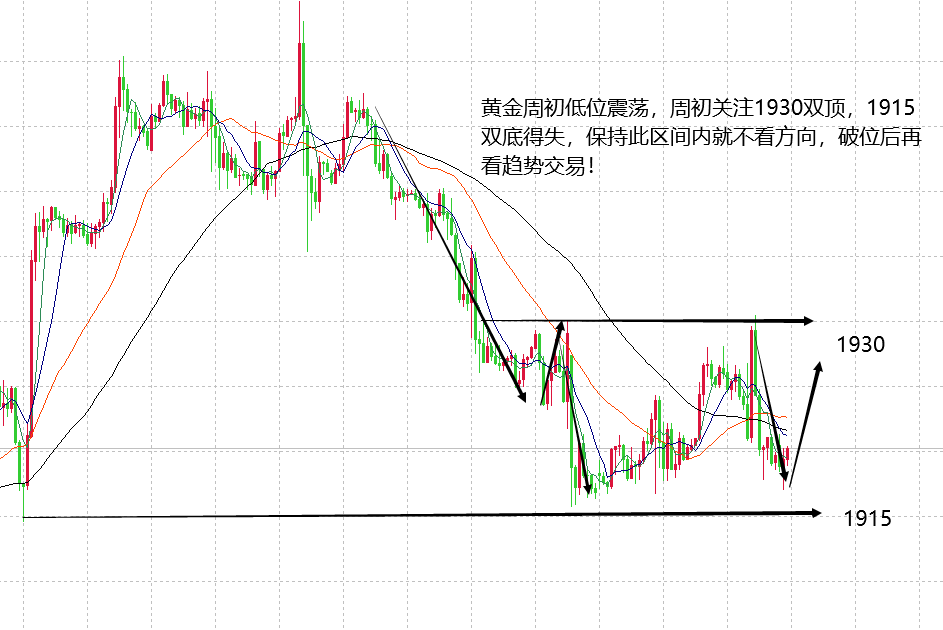 开篇先强调黄金当下核心思路:周内看上行,周初看震荡,1930/1915区间明确,等待破位。回归到全盘行情,上周黄金在1946高位震荡慢跌,周三跌至1915关键支撑点,这个点位也是山海一直强调的强弱关键点,此点位没有破位,给周四,周五震荡提供了必要条件,虽然周四,周五有反弹空间,但反弹力度一直未能破位1930,而且在1930形成双顶压制点,因此,留给本周黄金能确定的区间在1930/1915区间震荡,周内破位上下关键点方可看延续空间。本周周三关注cpi数据,此数据或将改变暂时黄金的走法,包括可能会改变周内行情的预测,建议尽量避开数据做有效交易。从技术面来看,前期黄金大涨至1953,上周黄金又从1946跌至1915,目前止跌在1915,此点位已经试探多次不破,具体表现在日线布林中轨之上,那么,近期黄金只要不破日线布林中轨就难以看出大跌空间,因此,当周中,黄金更看好黄金向上破位1930,去前期高点1952,当然,如果黄金在本周跌破1915,下方空间也很大,可以去1890低点。在小周期中,H4周期震荡区间明显,各方面都是震荡表现,布林收口,均线平缓发散,区间也在标准的1930/1915之内,因此,周初只要不破此区间,看好在此有效区间之内做高空低多的积累交易,破位此区间之后再看顺势交易,行情变化的时间节点也在周三。