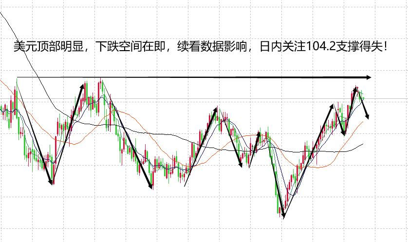 美元在周二走标准的高位震荡,虽然没有出现新高,破位新高,但实际走势有很强的诱导性,因为前期回落至104.2没有破位,所以,整体还是强势震荡,美盘在此冲高至104.8,有非常强势的持续上涨表现,从午夜收盘来看,黄金收在104.5附近,周期性还是表现为高位震荡,等待下跌后对关键支撑点的试探。前面强调过,这波美元的强弱关键点在104.2,趋势关键点在102.8,跌破104.2后看弱势,跌破102.8后看空头。今晚CPI数据或能有效破位104.2强弱关键点。