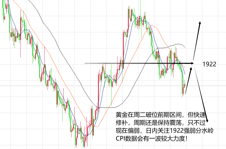 开篇先强调黄金当下核心思路:黄金震荡偏弱,关注1922得失,等待CPI数据影响。周初强调黄金在1930/1915区间看震荡,在不破的前提下可以随意高空低多,周一如此,周二实际也是如此,只不过被一波市场砸盘影响,走出了下跌空间,还是黄金最终收盘在1915附近,虽然破位1915,形成弱势震荡,但并不是绝对的单边状态,因此,留给周三的看法黄金还是在震荡周期中。重点等待市场CPI数据的指引。通过技术盘面看,经过周二的下跌,日线在周二收阴,并且破位前面多次试探不破的布林中轨支撑点1915,所以,可以肯定,黄金从前期的震荡区间变为弱势震荡,日线周期或可看跌至布林下轨支撑点1890,所以,下方空间很大,近期只要没有再次站稳在1915之上就要看弱势下跌。但H4周期目前非可以直接看跌,在下跌后,欧美盘走出低位反弹,H4周期在低位形成连阳,布林虽然开口,但没有形成绝对的极弱单边,所以,这波弱势,大概率是震荡弱势,因此,要看空也要等待反弹至关键点做空,切忌直接追空,日内上方单边均线压制点在1922/1920附近,但也有一个可能出现,黄金在今天的反弹中站稳1922,如果确定站稳1922,那么黄金可能借助美盘数据,或再次冲高,也有再次去1930的可能。所以,日内黄金暂时表现是弱势震荡,等待反弹1922/1920压制得失,同时关注数据影响。