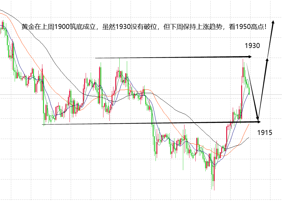 上周黄金先跌后涨,山海带领大家做出了有效的判断,也强调了1900可能出现多空转换的空间,实际行情也是如此,周初下跌至1900,周三转势,周四,周五延续上涨至1930,虽然尾盘黄金没有破位1930,但不影响这波黄金在下周看涨至1950高点。需要强调下周黄金的核心思路是看涨至1950,但由于1930不破,也不能看作是单边上涨,所以,下周大概率是震荡慢涨。上面强调过,下周有几个重点数据需要公布,特别是美联储公布利率决议,预计本次不加息,大概率对当下行情影响不大,所以,虽然需要关注,但不必过分担忧。从盘中技术面来看,黄金的日线周期已经收口,并且在周四,周五出现连阳走高,很明显,这种状态之下,黄金肯定还会继续走高,试探日线布林上轨高点1950,因此,下周主体思路坚决看涨至1950高点。在小周期中有两点值得注意看,第一,暂时黄金在1930没有破位,形成局部三顶压制,第二,经过周尾盘下跌,H4周期在高位收阴,并且下一根k阴线收在布林上轨之下,暂时表现不出强势单边上涨,因此,下周预计还有震荡回落空间,再看趋势上涨高度。整体来看,下周关注低点支撑1920,1915,1905,上方关注1930,1950,其中,1930破位可看单边上涨,就不要再考虑有高位压制回落空间。