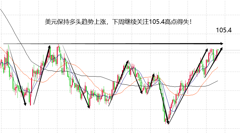 美元市场在上周确定104.2支撑不破的情况下继续走趋势上涨,虽然没有破位前高105.4,但收盘同样在高位明显可以看出未来走势依旧是在多头趋势中继续看涨。因此,下周美元肯定会破位105.4高点,至于是震荡慢涨,还是走单边上涨,还得看下周美联储利率决议影响。按照美元的如此走势,黄金可能在下周受压,难以走出较大空间。不过,如果美元在105.4高点一直不破,也可能形成三顶走出慢跌空间。这两种可能需等待数据公布后再判断。