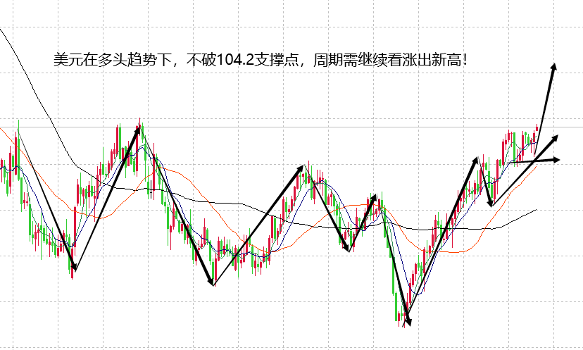 美元继续保持在预期中的表现,前面讲过美元的强弱支撑在104.2,趋势支撑在102.8,只要试探不破这两个点位就无法改变强弱状态或者多空趋势,在美联储利率维持不变的背景下,美元周三再次回落至104.2不破,走出顺势多头大涨空间,暂时价位在105.2,又要考验105.4前期高点的得失。首先要肯定的是,近期美元是绝对的多头强势,所以105.4必破,上方不猜高,所以,在此环境下,黄金会饱受打压,走出下跌,刚好也符合近期黄金上涨至1950开跌的节奏,因此,美元近期看涨不猜顶,黄金开始转向看空。