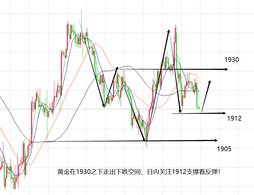 开篇先讲黄金当日走势的主思路:周二黄金在1912支撑上看震荡反弹。周一黄金坚持在1930之下看震荡偏弱,实际行情也实现了山海的预测,黄金从1928开跌,连续到美盘,在美元极强,市场砸盘的影响下,走出了一波下跌空间,最低下跌至1915,基本实现了山海对本周行情小区间的预测,那么,在当下震荡环境中,就要关注小周期1930/1912是否破位,如果小周期不破,就更不用说可以去大区间1945/1902了。目前价位在1915附近,因此,日内关注1912支撑点位得失,不破看好震荡反弹空间。从技术面来看,周一的下跌,日线再收阴线,基本技术形态不变,k线保持在日线布林中轨之下,延续下跌的话,下方可以看跌至布林下轨支撑点1902附近,所以,这种状态之下,近期还是一个弱势慢跌状态,等这个周期的下跌走完,才能走出日线周期的强弱转换,再看上方空间。但从H4周期可以看出,目前并不是极弱单边下跌,在周一的下跌中,并没有使H4周期布林下轨开口,甚至形成单边状态,所以,今天即使看好弱势,要保持周一美盘的弱势,也不能在1912支撑之上追空,按照H4周期布林收口来看,暂时区间在1930/1912,日内保持在1912之上,还有可能走出震荡反弹去1930,所以,日内短线交易,不强调走出单边方向,周二看好黄金有反弹空间。
