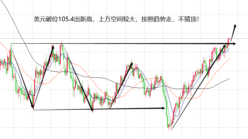 美元按照预期的继续走高,没有悬念,刷新高点,无高点可看,上方空间很大,多头还是持续中。目前美元收盘在105.7附近,随着有效冲高,下方关键支撑点也在抬高,周期性强弱点从104.2提高到105,所以,本周只要保持在105之上就一定是看强势上涨,跌破105后再看多头趋势下的高位震荡。周二美元保持多头趋势上涨不变,预计上方可见106,如果走出震荡回落就看105的得失。