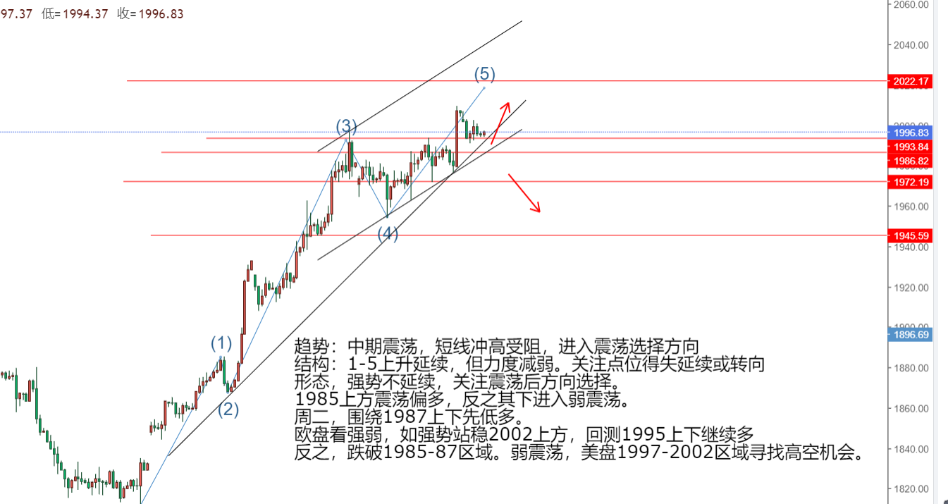周二,月线收官,谨防月尾行情冲高回落的可能。盘中注意1990-85区域被下破的可能。如下破短线需要注意偏多转弱震荡的可能。而上方2002-06站稳将继续走强。所以今天等待关键位置得失在去操作会更好。