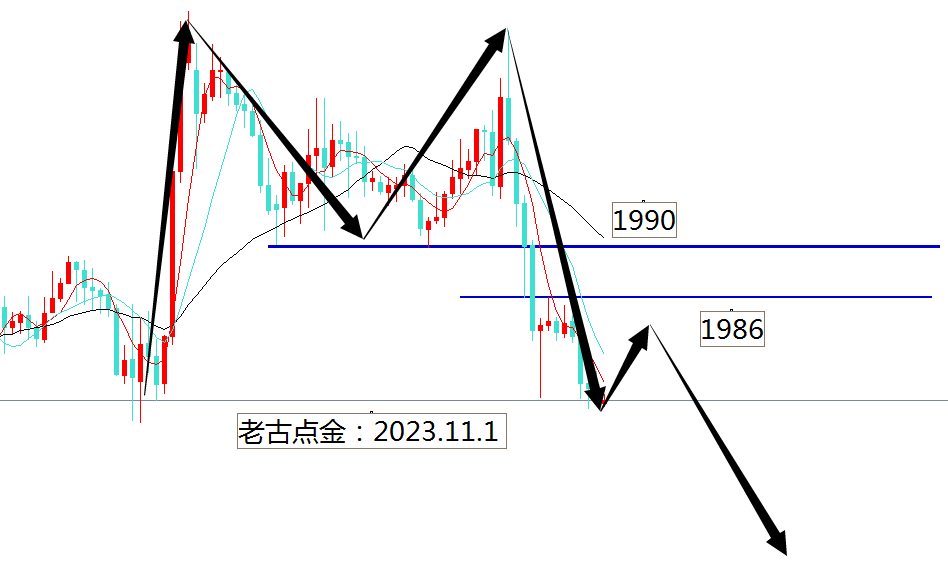 黄金白盘关注1986下面的空单机会,小时级别压力就在1986附近,小压力是1981可以直接空,另外白盘的超级压力也是1990附近,这个位置是大空头必空的位置。白盘 关注1976之前的低点支撑。