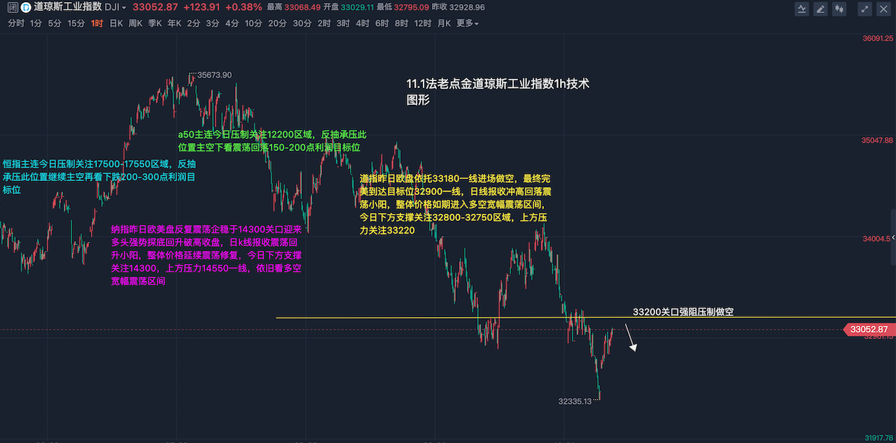 道指昨日欧盘依托33180一线进场做空,最终完美到达目标位32900一线,日线报收冲高回落震荡小阳,整体价格如期进入多空宽幅震荡区间,今日下方支撑继续关注32800-32750区域,上方压力关注33200-33250区域,日线级别在经历连续两日的反弹回升收依旧压制运行于10日均线以及20日均线下方维持压制震荡,目前多空强弱分水岭关注33400关口,日线级别压制此位置下方依旧延续压制偏空节奏,今日反抽依托33200关口继续先空一次下看震荡回落,今日下方支撑关注32750-32800区域,亚欧盘回踩企稳此位置可短多一次再看反弹回升,日内整体依托此区间高空低多循环参与看多空宽幅震荡区间,中间位置一律多看少动谨慎追单,耐心等待关键点位进场,纳指昨日欧美盘反复震荡企稳于14300关口迎来多头探底回升收盘,日k线报收震荡回升小阳,整体价格延续震荡修复,今日下方支撑关注14300一线,压力14550上方,依旧看多空宽幅震荡区间,目前道指纳指虽然整体技术面出现低位超跌反抽,不过依旧压制运行于日线级别长期均线下方运行,短线反弹不改整体压制空头形态,反抽关键压力位进场做空依旧是主基调,具体操作策略盘中实时提示,及时关注。