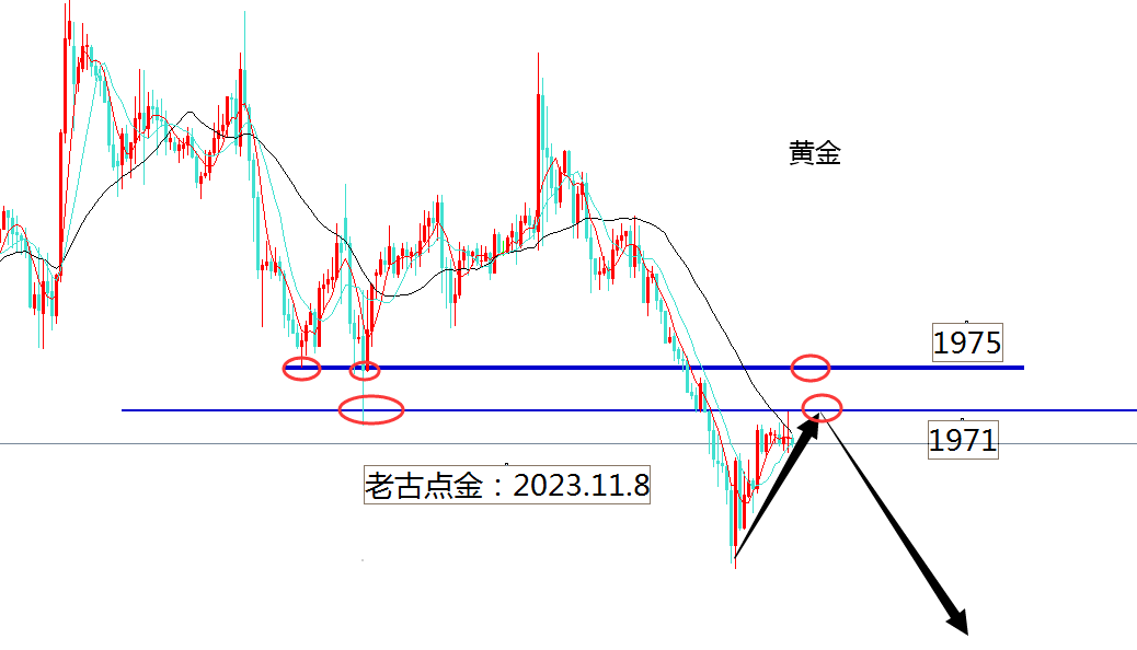 黄金的昨天的行情破了1969的位置,这个位置的破位置确定了空头的地位,在K线形态上形成了一个弧形的K线形态,这是一个看跌的信号,而且日线级的头肩顶形态也是初现,这些都是大空头启动的信号,我们不去猜测遥远的趋势,就目前老古看见的盘面已经是空头,所以操作上我们继续找空头上车的机会,昨天的行情1965空也只是小喝汤,早盘1969我们再次空了,继续空吧,今天的1953很关键,这个位置破了将会带来瀑布跌。