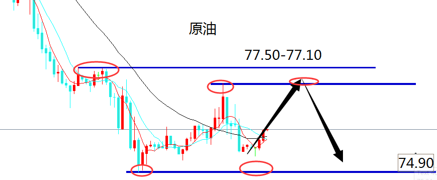 近期的原油一直是大空头,昨天日线出现了反弹,最终日线收大大十字星,原油出现了下跌疲软信号,这是一个见底信号吗?老古目前还不确实,但是可以确定的是它是一个疲软信号,今天的原油多头也可以参与了,大方向还是空,空单还是主菜,原油关注77.50-77.10的压力,支撑关注74.90附近。