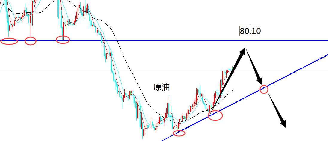 近两天的原油开始反弹了,多空博弈多头稍微变强,日线两个交易日收阳,昨天晚上我们也是精准的在77.10布局多单大赚,这波反弹的超级压力是80.00附近,今天预估还有反弹空间,今天的原油多空都可以上看位置,下面的支撑77.00是新的支撑了,压力80.10附近,小的压力78.80。
