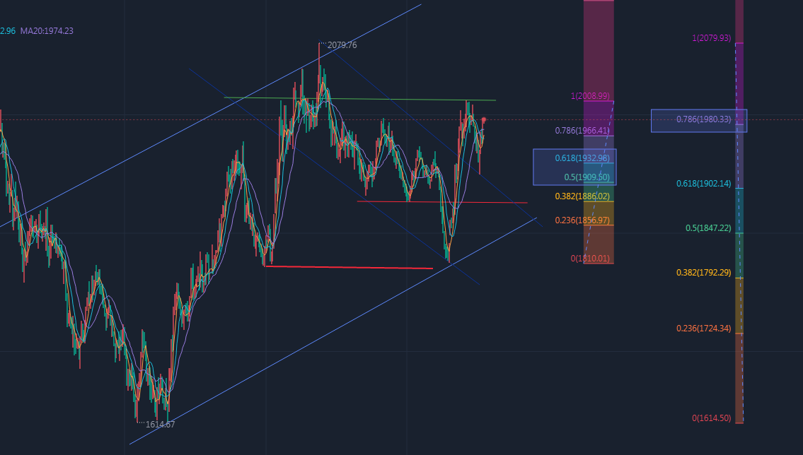 11/17 11 : 11黄金前面整体走势在我们预期的一致,2002一线最高2008受压回撤,1932一线支撑,从前面在2002一线反复做空,到1932一线反手做多,几乎整个区间我们都悉数拿下,本次1928一线支撑走高后,上行速度较快,昨晚也触及前期平行压制1988这里暂时滞涨,上破1988有望继续上行2002-2008甚至直接突破,那么后期2008及2070一线高点也是很大概率再次触及的。