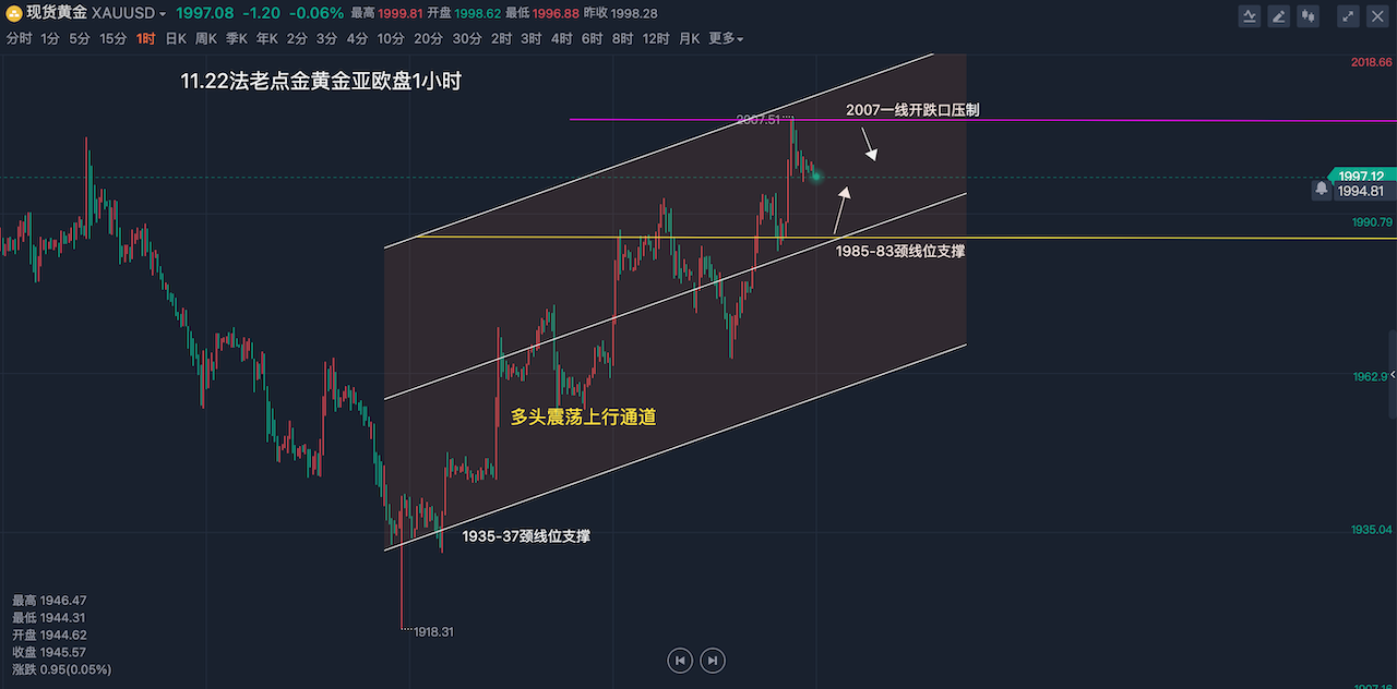 11/22 09 : 0911月22日【黄金原油】亚欧盘:黄金昨1994空完美扫止盈,美盘前1983多未能进场,今日反抽2007上方先空再看回落,原油昨日76.8多遗憾未能进场,今日回踩依托77关口继续先多再看反弹回升