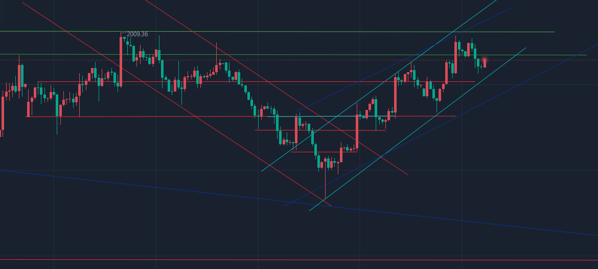 11/23 10 : 08 ; ; ; ;黄金前面我们给出前期2004-07-09都是综合平行压制,并且多单也都止盈了这一线,开始在2007最高点2006做空,昨天在2000和2005分别做空,晚间1999一线继续做空,回撤了第一目标1987,最低1986,不过我们三个空单全部止盈在了1990,尾盘提示依据日线MA5和4小时MA20的支撑1986左右上方1990做多,不过上行力度欠佳,早间我们也是提示在1991上方保本出来,但是空头在技术面上是没有到位的,下方目标分别是如图上行通道下轨1982和1972,多单不着急介入,上行还要找位置做空看回撤。