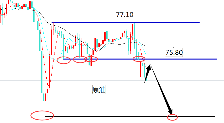 说大实话原油不是一般人玩的产品,我们在近几个月里也是损失了不少元子,全部是因为它的来回洗,原油如果按顺趋势模式去操作是很难把握到大利润,它的浪结构基本不延续,主打的就一个随心所欲的浪盘,不过在周线K线图上看大周期它还是一个大空头中,是属于大跌中了大浪盘下,上周的原油也是经历几波大震荡,周线十字星,这周的原油我们思路还是看大震荡。大方向看跌,重点去找它荡盘的节奏。今天的白盘大家关注75.80的空单机会。