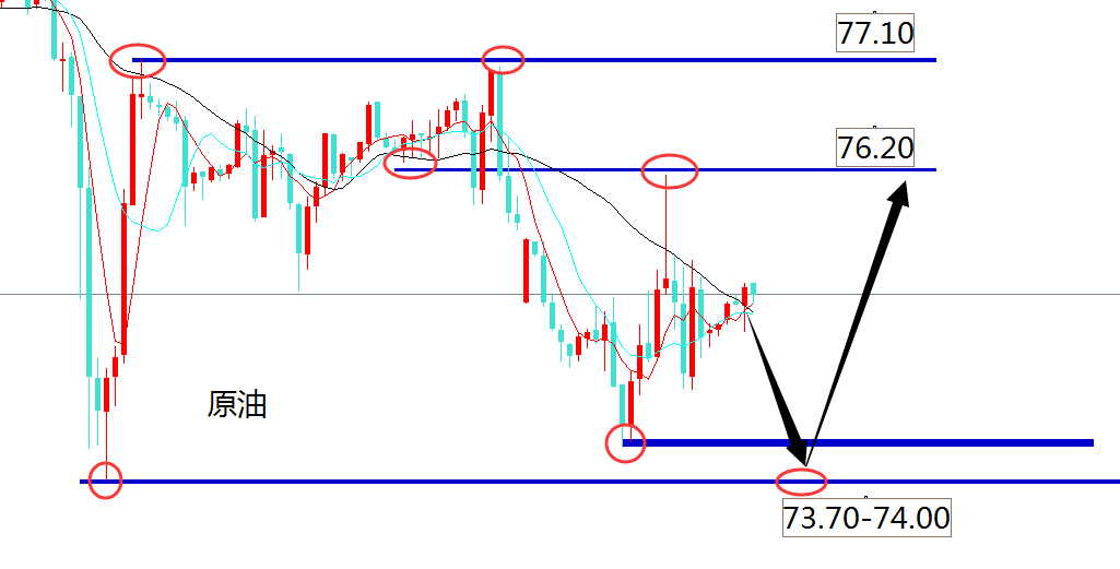 昨天我们布局的75.60空单大跌,原油目前看形态它不是一个单边跌的行情,多空来回大荡盘还是会延续,今天关注上面我们画的分析图的区间,下面73.70-74.00是强支撑带,也是多头反攻的底部,上面关注76.20和77.10的压制,原油大方向还是看跌的,现在是大跌后的一个大修复动作。