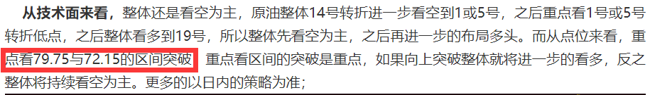 从技术面来看,整体还是先看空为主,原油重点看5号转折,之后预期整体看多到19号,所以整体先看空为主,之后再进一步的布局多头。而从点位来看,还是看79.75与72.15的区间突破这点不变,如果向上突破整体就将进一步的看多,反之整体将持续看空为主,当然当下也是相对低位,如果持有大量空头的,下周考虑平空加多是思路,及时收割利润也很重要,更多的以日内的策略为准 :