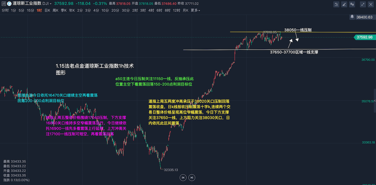 道指上周五两度冲高承压于38020关口压制回落震荡收盘,日k线报收压制震荡十字k,连续两个交易日整体价格呈现高位窄幅震荡走势,短期价格继续以时间换空间延续高位窄幅震荡整理,今日下方支撑关注37650一线,上方阻力关注38050关口,日内依托此区间高空低多循环参与看多空震荡运行节奏,中间位置一律多看少动谨慎追单,耐心等待关键点位进场,纳指上周五整体价格围绕17040压制再度报收震荡十字k,短期价格围绕5日均线以及10日均线窄幅震荡整理,今日下方支撑关注16860关口,日内回踩依托此位置先多看震荡上行延续,上方冲高关注17100一线压制可短空,再看震荡回落,短期道指纳指进入到多空窄幅震荡区域内运行,继续保持高空低多循环参与看震荡运行节奏为主,耐心等待关键点位进场,切勿追涨杀跌,耐心等待关键点位进场,盘中策略实时给出,注意及时关注。