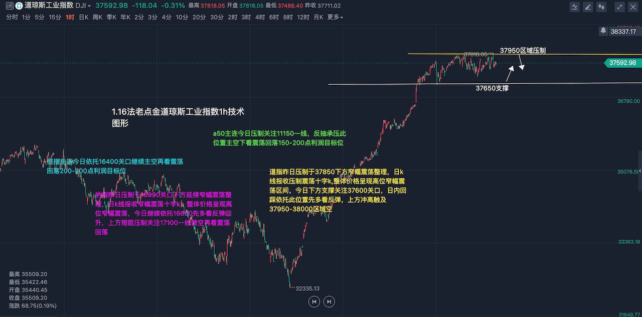 道指昨日压制于37800下方窄幅震荡整理,日k线报收压制震荡十字k,连续三个交易日整体价格呈现高位窄幅震荡走势,短期价格继续以时间换空间延续高位窄幅震荡整理,今日下方支撑关注37600一线,上方阻力关注38050关口,日内依托此区间高空低多循环参与看多空震荡运行节奏,中间位置一律多看少动谨慎追单,耐心等待关键点位进场,纳指昨日全天压制于16980下方呈现窄幅震荡整理,短期价格围绕5日均线以及10日均线以时间换空间震荡运行,整体区域依旧维持高位震荡,今日下方支撑关注16800关口,日内回踩依托此位置先多看震荡上行延续,上方冲高关注17100一线压制可短空,再看震荡回落,短期道指纳指进入到多空窄幅震荡区域内运行,继续保持高空低多循环参与看震荡运行节奏为主,耐心等待关键点位进场,切勿追涨杀跌,中间位置一律多看少动谨慎追单,盘中策略实时给出,注意及时关注。