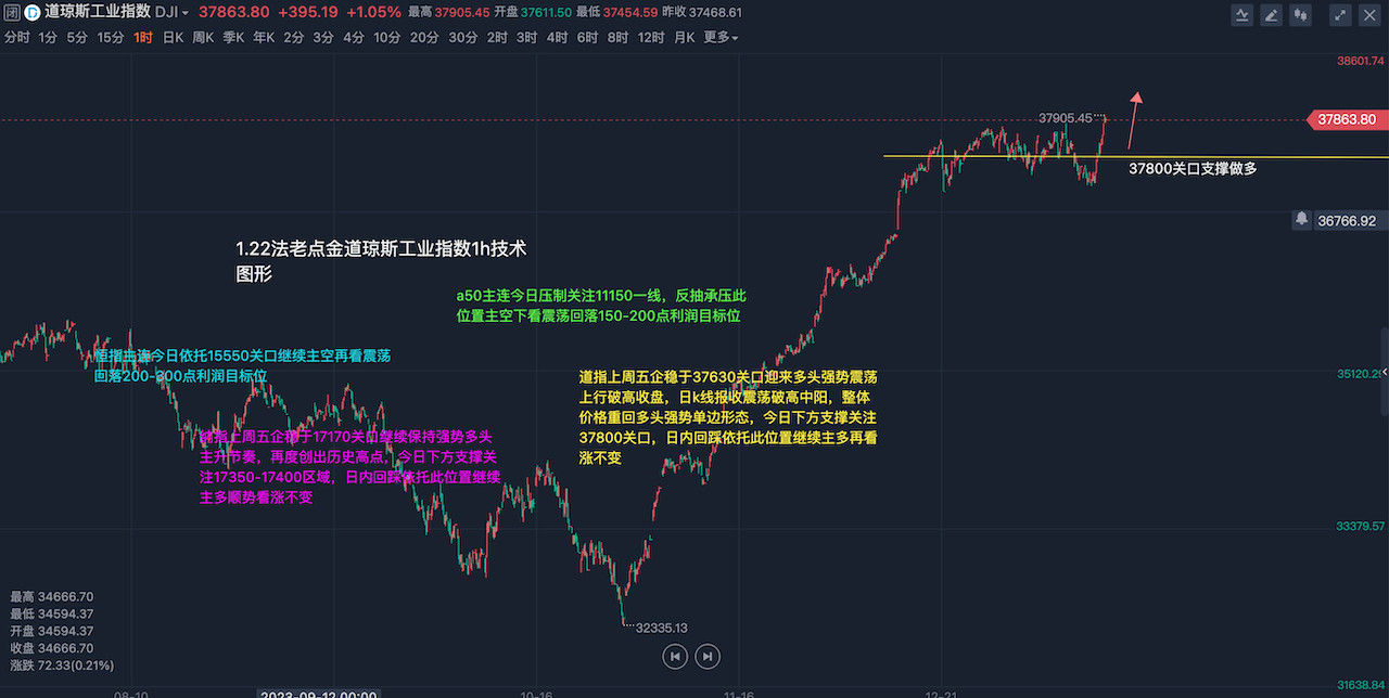 道指上周五企稳于37630关口迎来多头强势震荡上行破高收盘,日k线报收震荡破高中阳,日线级别重回5日均线上方再度完成破高,整体价格重回多头强势单边形态,今日下方支撑关注37800关口,日内回踩依托此位置继续顺势主多再看涨不变,近期道指在经历连续两周的高位强势调整后重回多头主升形态中,短期还有进一步冲高上行预期,近期多头强势分界线上移至37600关口,日线级别企稳此位置上方依旧保持顺势低多节奏不变,纳指上周五企稳于17170关口继续加速上行破高保持强势多头主升节奏,并再度创出历史高点,日线级别三连阳完成高位强势修正,今日下方支撑关注17350-17400区域,日内回踩依托此位置继续主多顺势看涨不变整,近期道指和纳指在经历两周的高位震荡后重回多头极强单边形态中,继续保持回踩顺势低多节奏为主,在未出现明确压制形态前逆势空单需谨慎,具体策略盘中实时给出,注意及时关注。