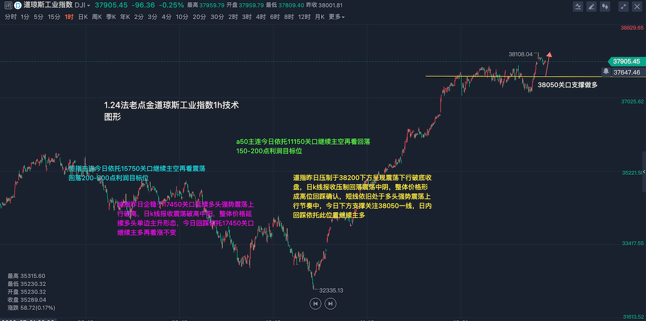 道指昨日压制于38200下方呈现震荡下行破底收盘,日k线报收压制回落震荡中阴,整体价格形成高位回踩5日均线确认,不过短期技术指标依旧处于多头强势震荡上行节奏中,一日回撤不改变中期多头主升节奏,今日下方支撑关注38050一线,日内回踩依托此位置继续主多再看涨不变,道指短期多头强势分界线上移至37600关口,日线级别企稳此位置上方依旧保持顺势低多节奏不变,纳指昨日企稳于17450关口延续多头强势震荡上行破高收盘,日k线报强势中阳,整体价格依托5日均线延续多头强势单边主升形态,今日回踩依托17500关口继续主多再看涨不变,多头强势主升形态继续保持顺势参与为主,任何回踩均是做多机会,在未出现明确压制形态前逆势空单需谨慎,具体策略盘中实时给出,注意及时关注。