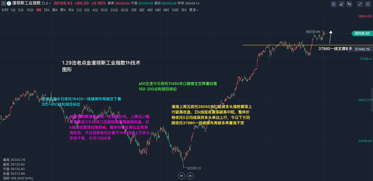 道指上周五依托38050关口延续多头强势震荡上行破高收盘,日k线报收震荡回升中阳,整体价格依托5日均线保持多头单边上行节奏,今日下方继续依托37980一线布局做多再看涨不变,道指短期多头强势分界线依旧关注37600关口,日线级别企稳此位置上方依旧保持顺势低多节奏,逆势空单一律不参与,纳指短期跟道指走势出现一定程度分化,上周五小幅反弹承压17630关口压制回落震荡破底收盘,日k线报收震荡回落阴线,整体价格在高位出现滞涨形态,不过目前依旧企稳于10日均线上方维持多头主升形态,短线调整不改多头强势主升形态,今日下方支撑关注17400-17450区域,日内回踩依托此位置继续顺势主多看涨不变,道指纳指任何回踩均是做多机会,在未出现明确压制形态前逆势空单需谨慎,具体策略盘中实时给出,注意及时关注。