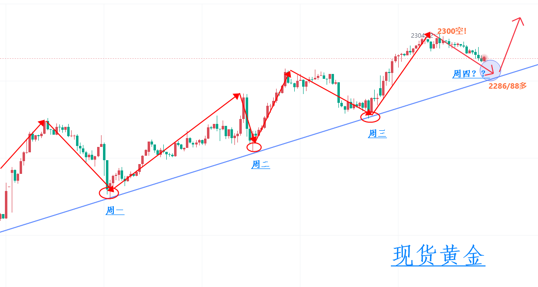 本周在过去的三个交易都在延续亚盘走高,欧盘调整,美盘进一步下探后企稳,夜间盘面再走高,从而进一步破高。每个交易日都在恪守这个形态节奏循环,那么本交易日我势必围绕循环节奏做布局,早间盘面为2300一线直接给出看空布局,主要拿的就是亚盘走高后欧盘的回调空间,目前已经回落2292下方,空单拿到一定的利润空间,减持后,保本损下看即可。 当然空头依然是回调,依然是修正,短线空只是小菜,主多才是大餐,本交易日借助欧盘的回落,美盘企稳后依然要做多单跟进,这里关注本周整个回踩的上升支撑线,当下支撑位置上移到2286/88一带,那么本交日易就围绕这一代支撑做短多参与,同时这里也是我们短线空单的离场点。